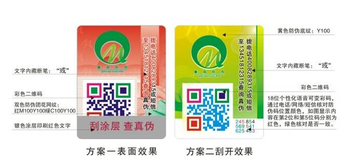 彩碼辨色防偽技術(shù)是通過公司的核心防偽技術(shù)信息化編碼/解碼,為每件產(chǎn)品生成唯一的防偽碼及具體每一位防偽碼的顏色,(具體有紅、橙、黃、綠、青、蘭、紫、黑8色,并用專用軟件將彩色防偽碼印制在標(biāo)貼紙上,同時將其彩色碼信息存儲在防偽數(shù)據(jù)庫中。通過電話、網(wǎng)絡(luò)等方式調(diào)取存儲的防偽碼及防偽碼的顏色信息,與其標(biāo)貼上的防偽碼顏色及防偽碼信息來比較是否一致,確定所查尋該產(chǎn)品的真?zhèn)巍?BR> 彩碼可變二維碼防偽標(biāo)簽特點:1、多重防偽,性能可靠。其防偽信息,既有防偽碼數(shù)字信息又有每一位防偽碼的顏色信息,還有材料的特征信息,實現(xiàn)了三重防偽;2、有效地控制抄寫防偽碼復(fù)制。造假者即使抄寫防偽碼抄顏色復(fù)制,以菲林出片方式印制每枚標(biāo)簽最少要數(shù)百元;采取數(shù)字印刷方式,一枚標(biāo)簽也要花幾十元。成本高不劃算。3、從彩碼二維碼防偽標(biāo)簽有一個非常大的優(yōu)勢,識別簡便直觀,系統(tǒng)查詢完后,語音短信網(wǎng)絡(luò)會自動提示該產(chǎn)品的防偽碼及顏色信息。