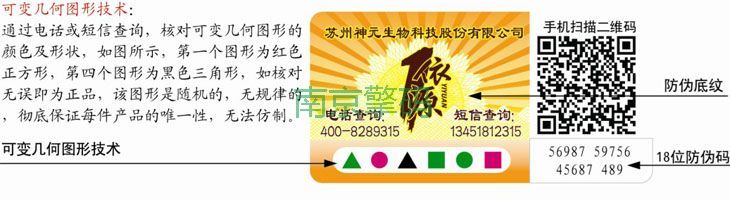 幾何圖形碼防偽技術集合數(shù)碼防偽的特點,讓每個單件產品或每枚標識賦予一組數(shù)碼圖形,把正在使用的標識上的查詢數(shù)碼輸入程序轉換的圖形與該標識上承載的圖形進行對比、驗證,確定是否一致,來鑒別產品真?zhèn)巍?BR> 幾何圖形碼防偽不僅可進行數(shù)碼防偽查詢,而且還可通過圖形對照來核對產品真假,起到雙重驗證的作用。 幾何圖形碼防偽既可用于一般商品防偽,也可用于物流防偽防竄貨管理。 1.采用信息編碼技術生成一組無規(guī)律的16-20位的查詢數(shù)碼; 2.生成一組有特定規(guī)則的的幾何圖形編碼,每組圖形編碼按照規(guī)則對應一組具有特定的幾何形狀的圖形組合,每個特定幾何形狀具有相同或不同的顏色; 3.在數(shù)據庫中將查詢數(shù)碼和幾何圖形編碼一一對應; 4.對每個商品給定一對查詢數(shù)碼個圖形編碼一一對應; 5.消費者通過數(shù)即可反饋圖形顏色的排列,與商品上的圖形組合進行對照,一致為真。 所述特定幾何形狀是規(guī)格多色的幾何形狀,例如:圓形、三角形、圓形及紅藍綠黑等,查詢數(shù)碼和圖形編碼具有唯一性,不可重復利用。 數(shù)碼圖形采用雙重編碼規(guī)則,保密性強,且圖形組合方便識別,在一定程度上能夠防止造假者大批量復制一個正確編碼。 幾何圖形碼防止應用范圍比較廣,本質上將查詢數(shù)碼和圖形組合同時附著在商品、商品外包裝、標識或標貼即可,其中圖形組合可以是明碼也可以設置為暗碼。
