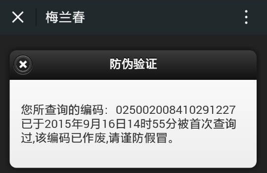 標(biāo)簽上的二維碼含有產(chǎn)品的身份編碼信息,每個產(chǎn)品的身份編碼都是唯一的,存于數(shù)據(jù)庫,消費者購買產(chǎn)品首次掃碼查詢,系統(tǒng)自動將二維碼含的身份信息與數(shù)據(jù)庫中比對,正確無誤返回生產(chǎn)廠商。再次查詢返回已被查詢,并且顯示出首次查詢時間。