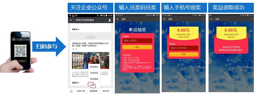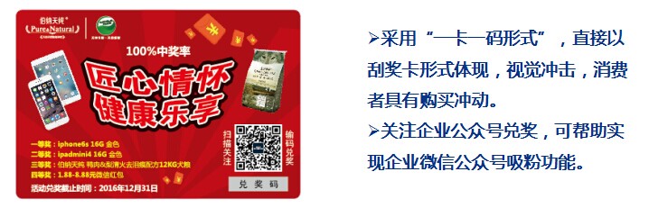 微信紅包促銷方案 你是否在為產(chǎn)品銷量業(yè)績發(fā)愁?你是否在為如何切入移動互聯(lián)網(wǎng)而不知所措? 有企業(yè)微信公眾號,卻苦于沒有粉絲量而發(fā)愁? 擎碼微信紅包促銷方案將幫你解決以上問題。 據(jù)統(tǒng)計,15年微信活躍用戶已達5.7億,如此大的市場導(dǎo)致眾多企業(yè)都想分一杯羹,紛紛申請注冊微信公眾號,希望借此機會將自己產(chǎn)品切入移動互聯(lián)網(wǎng)。當全部就緒時才發(fā)現(xiàn),關(guān)注用戶卻是寥寥無幾,營銷更是無從談起。真是萬事俱備,只欠東風,擎碼微信紅包促銷方案將幫你引來東風。 兌獎卡/標簽樣式: 將企業(yè)的公眾號二維碼印制在卡片上,兌獎碼以灰色圖層蓋住。 兌獎流程展示: 消費者掃描二維碼關(guān)注微信公眾號,進入兌獎欄目,輸入兌獎碼參與抽獎。 微信紅包方案給企業(yè)帶來的利益 1.激發(fā)消費者購買激情,實現(xiàn)產(chǎn)品促銷。 2.吸粉,獲取紅包必須先關(guān)注企業(yè)微信公眾號。海量產(chǎn)品吸引海量粉絲。 3.收集用戶資料,為以后營銷打下基礎(chǔ)。 4.具有防偽功能,每個產(chǎn)品擁有獨一無二的兌獎碼,無法仿制。 5.數(shù)據(jù)分析,進行區(qū)域化,年齡化等多方面統(tǒng)計分析,實現(xiàn)精準營銷。 |