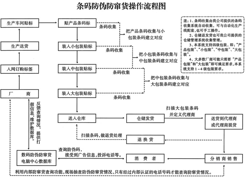 1、防竄貨原理 給每一件產(chǎn)品一個編碼,這個編碼以條形碼形式(二維碼),方便自動化采集。 在產(chǎn)品生產(chǎn)和出庫之前不知道此防竄貨編碼對應(yīng)的代理商,在出庫的時(shí)候配合我公司的軟件和條形碼(二維碼)掃描槍進(jìn)行定義,并把定義的信息傳到我公司的查詢數(shù)據(jù)庫,就可以用短信網(wǎng)絡(luò)的方式查詢代理商信息。 2、簡要流程 先由我公司查詢系統(tǒng)生成1位條形碼,并生成竄貨標(biāo)簽,交由企業(yè)貼到產(chǎn)品上。 然后再由我公司配套提供的“條碼收集器”和“倉儲管理軟件”軟件提供條碼收集和發(fā)貨管理。 3、簡要流程 系統(tǒng)生成條形碼,并生產(chǎn)標(biāo)簽——→產(chǎn)品貼標(biāo)簽,并掃描收集——→倉儲管理發(fā)貨,定義代理商名稱——→導(dǎo)出數(shù)據(jù),由查詢系統(tǒng)提供查詢服務(wù)